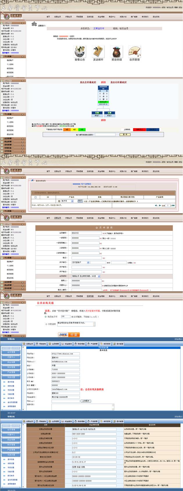本套直销软件采用:ASP+ACCESS开发,是一套双轨重消加极差直销软件,具体的玩法请看制度说明。