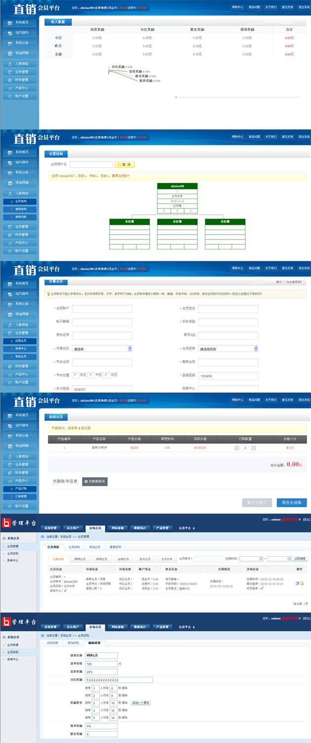 本套直销软件采用:PHP+MYSQL开发,是一套三轨带产品下单直销软件,具体的玩法请看制度说明。