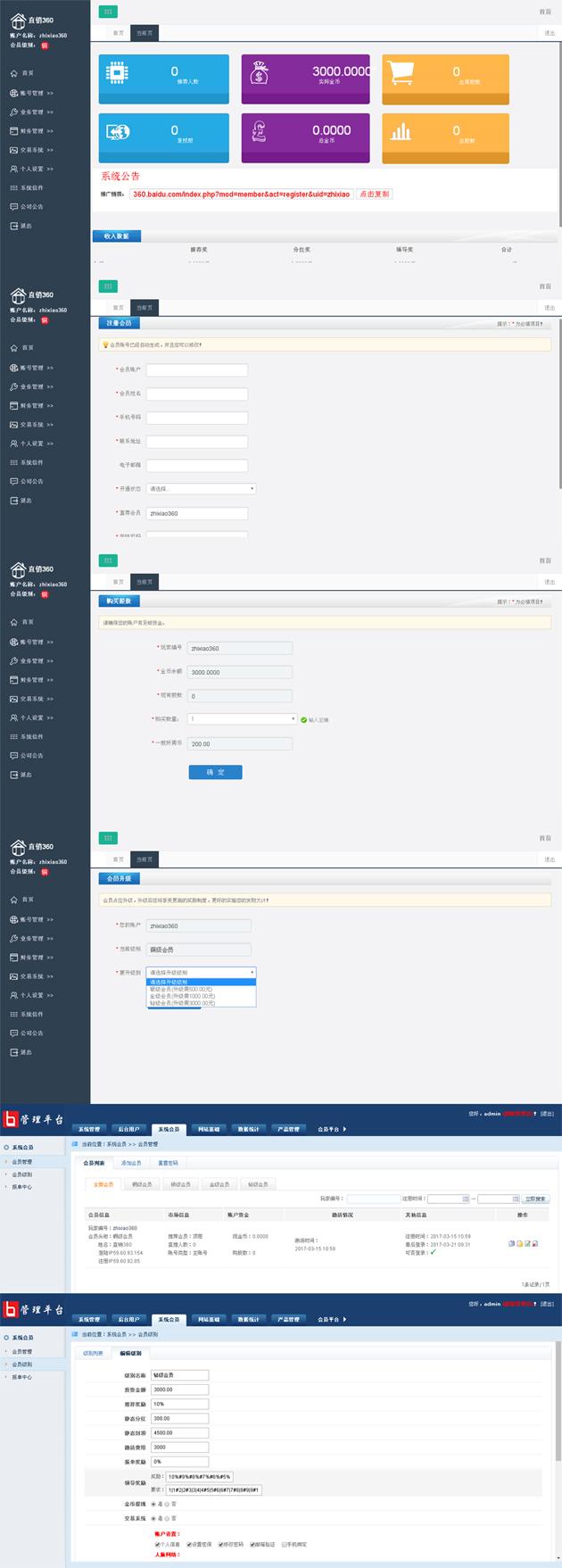 本套直销软件采用:PHP5.3+MYSQL开发,是一套多级别百元投资复利分红直销软件,带有WAP手机自适应版,具体的玩法请看制度说明。