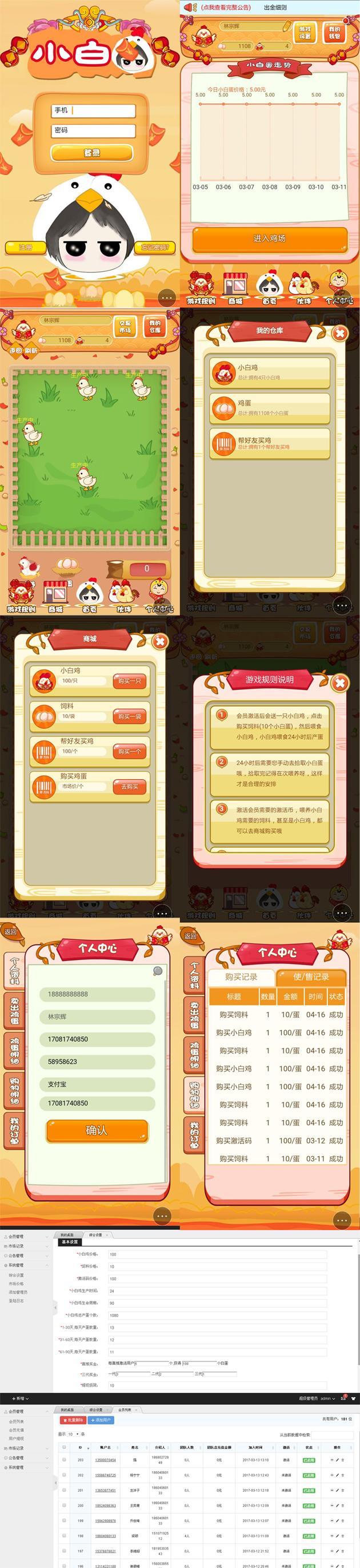 本套直销软件采用:PHP5.4+MYSQL开发,是一套小白鸡农场养鸡生蛋赚钱直销软件,WAP手机版可集成APP,具体的玩法请看制度说明。