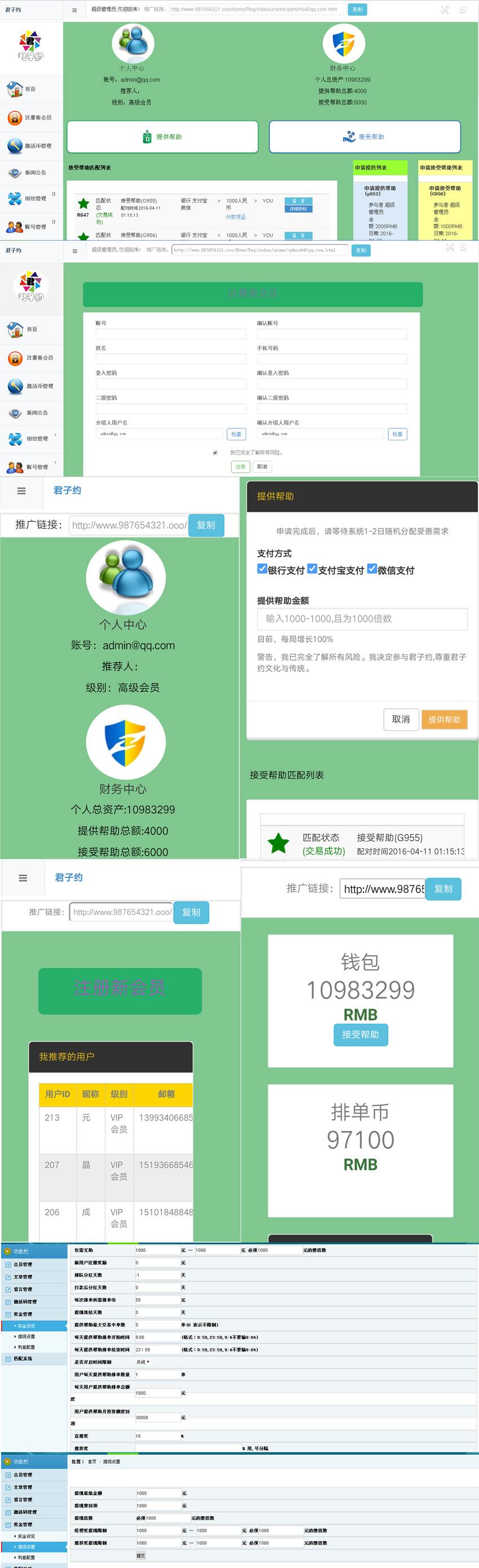 本套直销软件采用:PHP5.4+MYSQL开发,是一套君子约诚信创业直销软件,带有手机自适应可以打包APP,具体的玩法请看制度说明。
