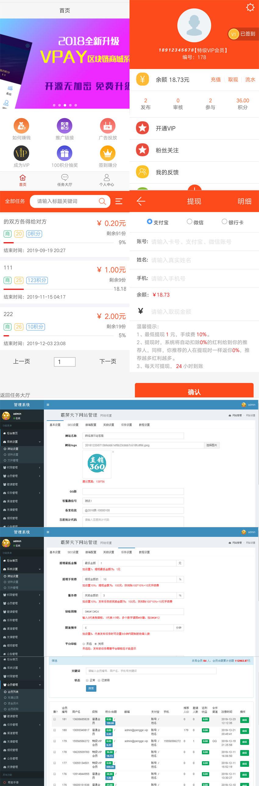6、后台系统界面,支持网站设置、权限管理、任务管理、渠道管理、充值提现、邀请好友等功能配置。