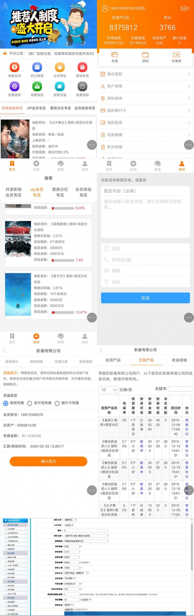 本套直销软件采用:PHP5.4+MYSQL开发,是一套影视电影项目众筹投资直销软件,手机端,可以打包APP,具体的玩法请看制度说明。