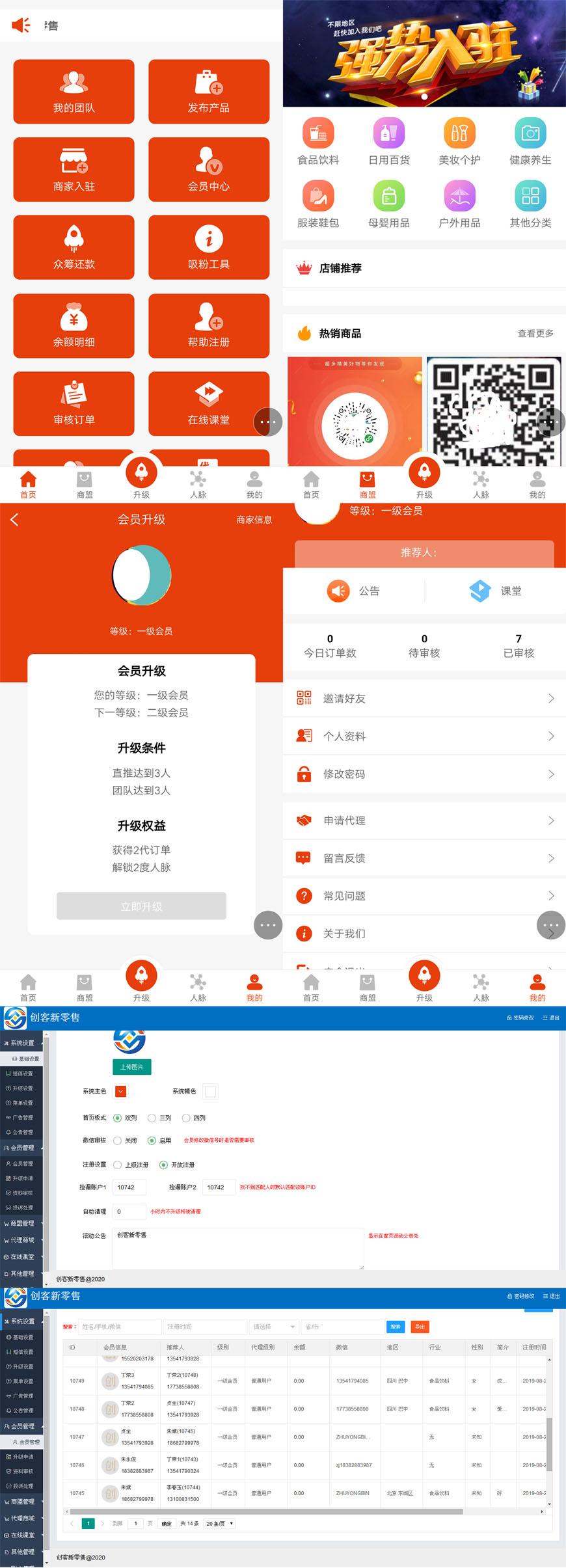 本套直销软件采用:PHP5.6+MYSQL开发,是一套创客新零售15星带代理商家直销软件,手机端,可以打包APP,具体的玩法请看制度说明。