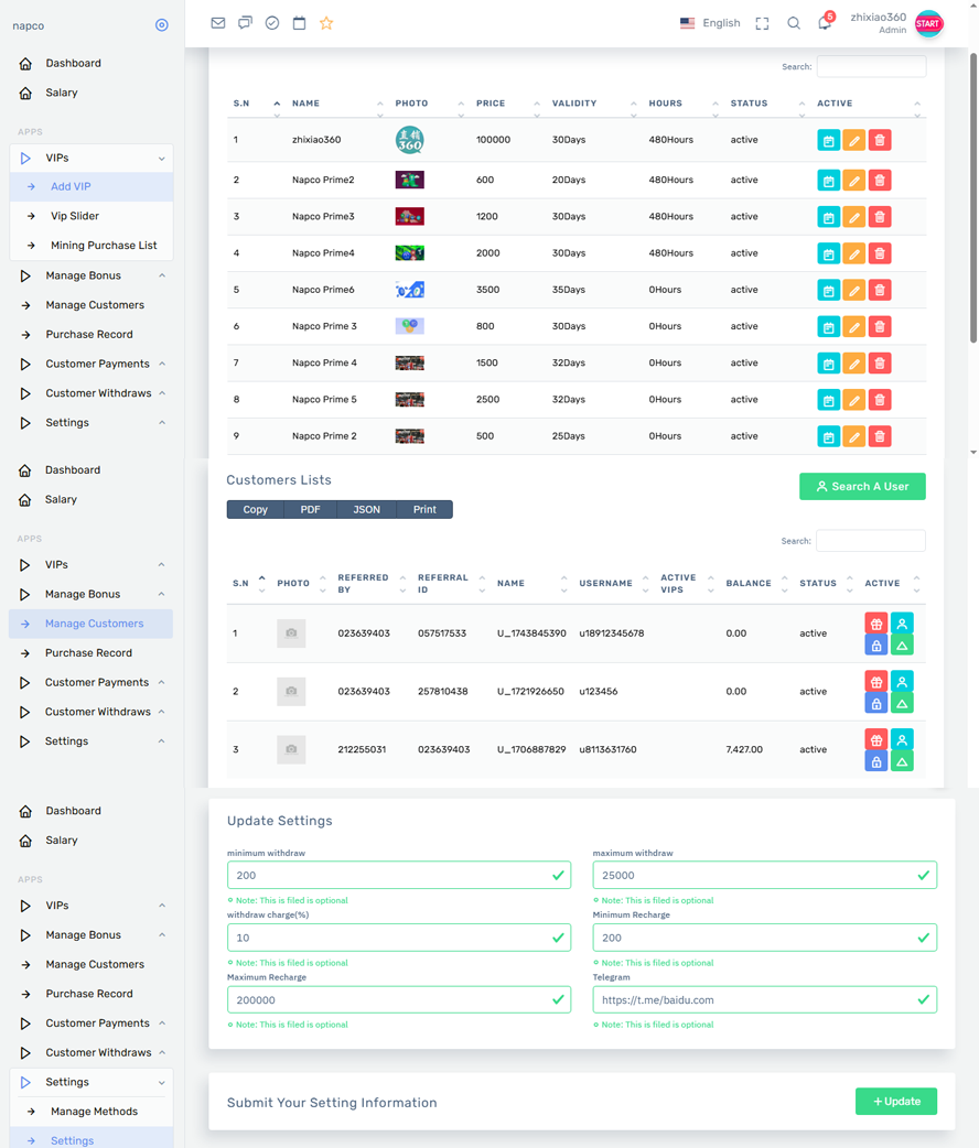 制度吧没有制度啦!它和之前发布的项目投资类似,比如充电宝还是其他的投资分红理财项目的软件一样,发布一个项目设置好分红比例,分红时间就好了,其他的都差不多一样,根据自己的需求而设置。唯一不同的这套是纯英文的,前台后台都是英文,本来是为老外使用的。如果你想做英文的项目平台很合适,还有这套软件它是后台手动点发放每日分红。