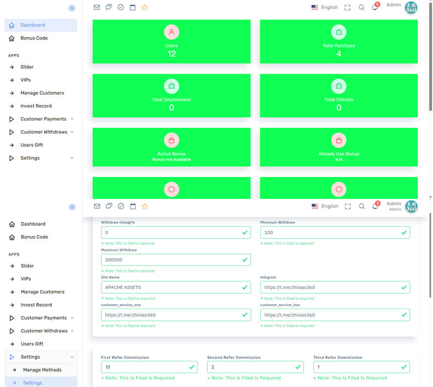 这套软件没有写制度了,因为还是和之前发布的一些充电宝、充电桩、还是按摩椅或机器人项目投资差不多,都是发布后台设置好的参数项目,会员购买后每天还是小时返利的模式,这个可以根据自己的需求去设置,所以制度就不写了。系统是前台和后台都是英文的,这几天发的一些都是纯英文的。还会继续发些。