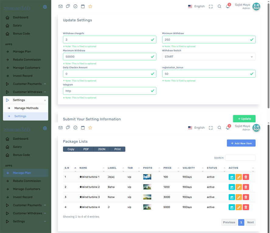 这套软件和上一套一样,没有制度,但是玩法都差不多一样,不一样的就是模板不同,具体的玩法就是后台发布项目,设置项目费用,分红周期,分红比例。然后前台会员进行投资。这套的分红需要每天后台点击发放薪资才可以的,也就是手动分红。其它的也就没有什么,前台后台一样都是英文。